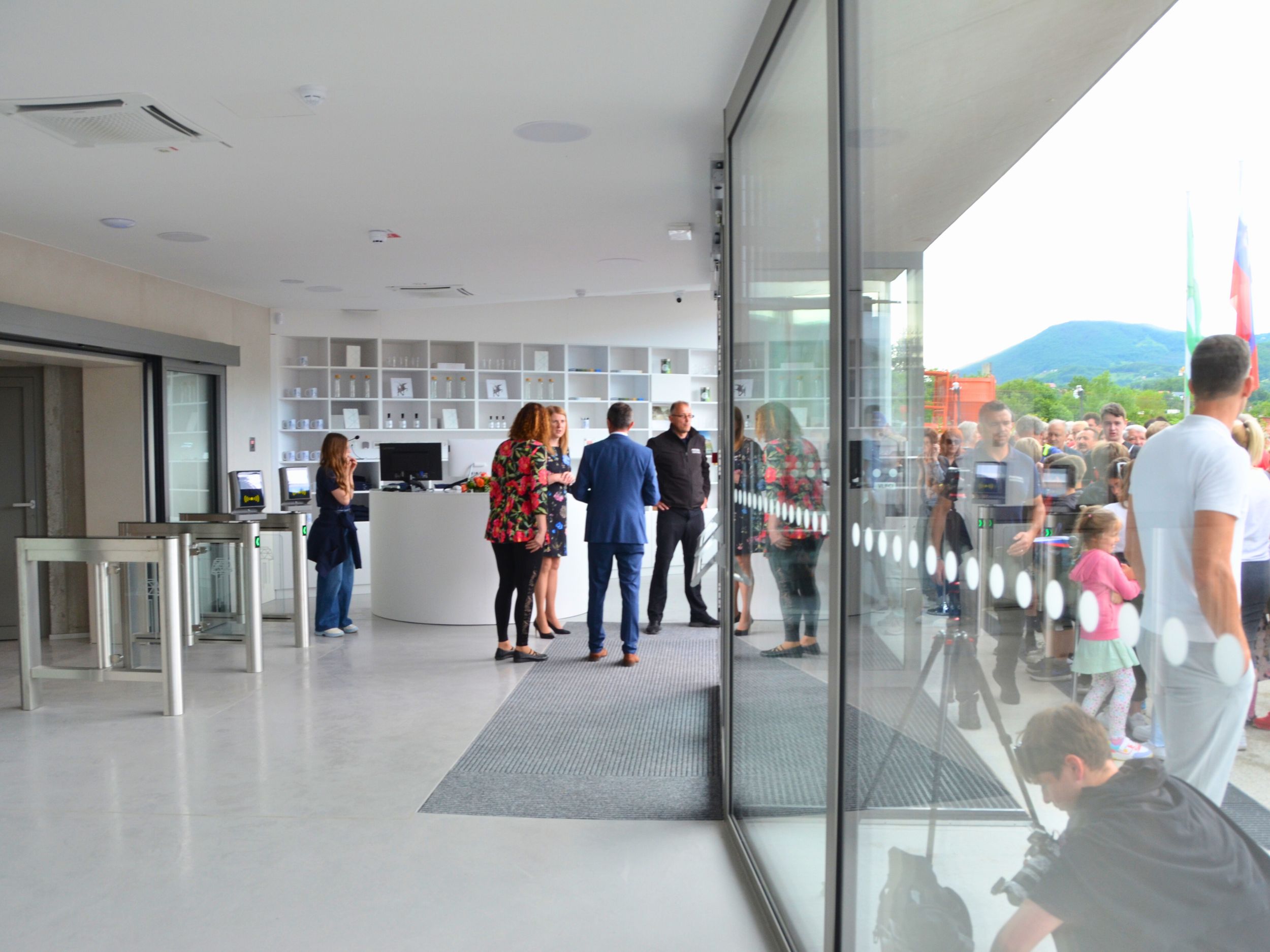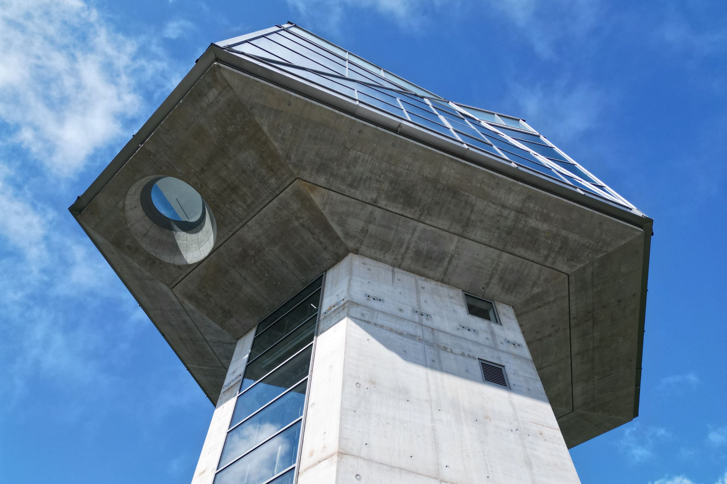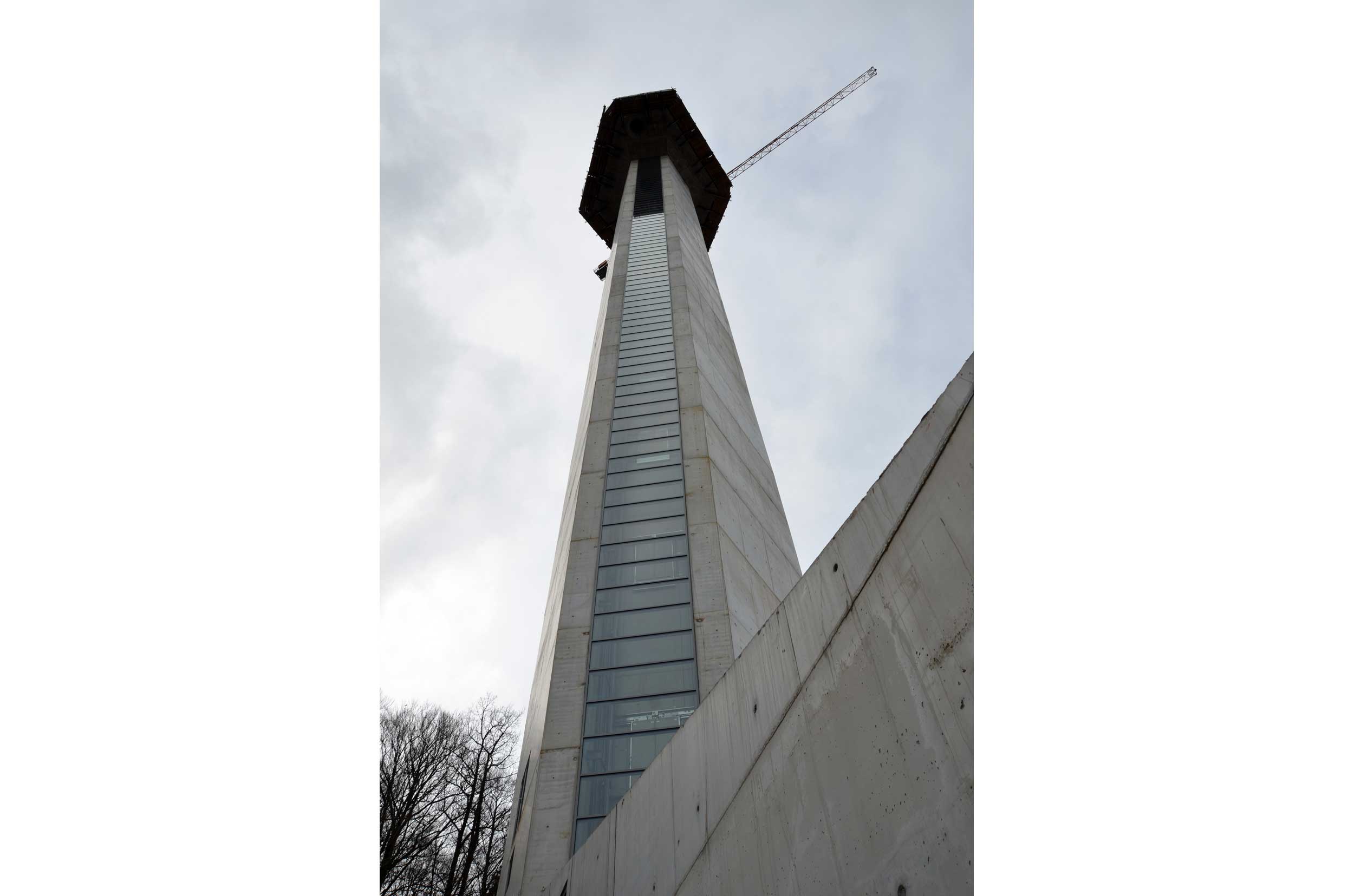 A two-story, symmetric designed observation deck, shaped as an abstract crystal form, houses the cafe, the Panorama floor and the outdoor deck. The tower provides views of Rogaška Slatina and its surroundings and will further diversify the offer of the town, known for its mineral water, health resorts and glassworks.