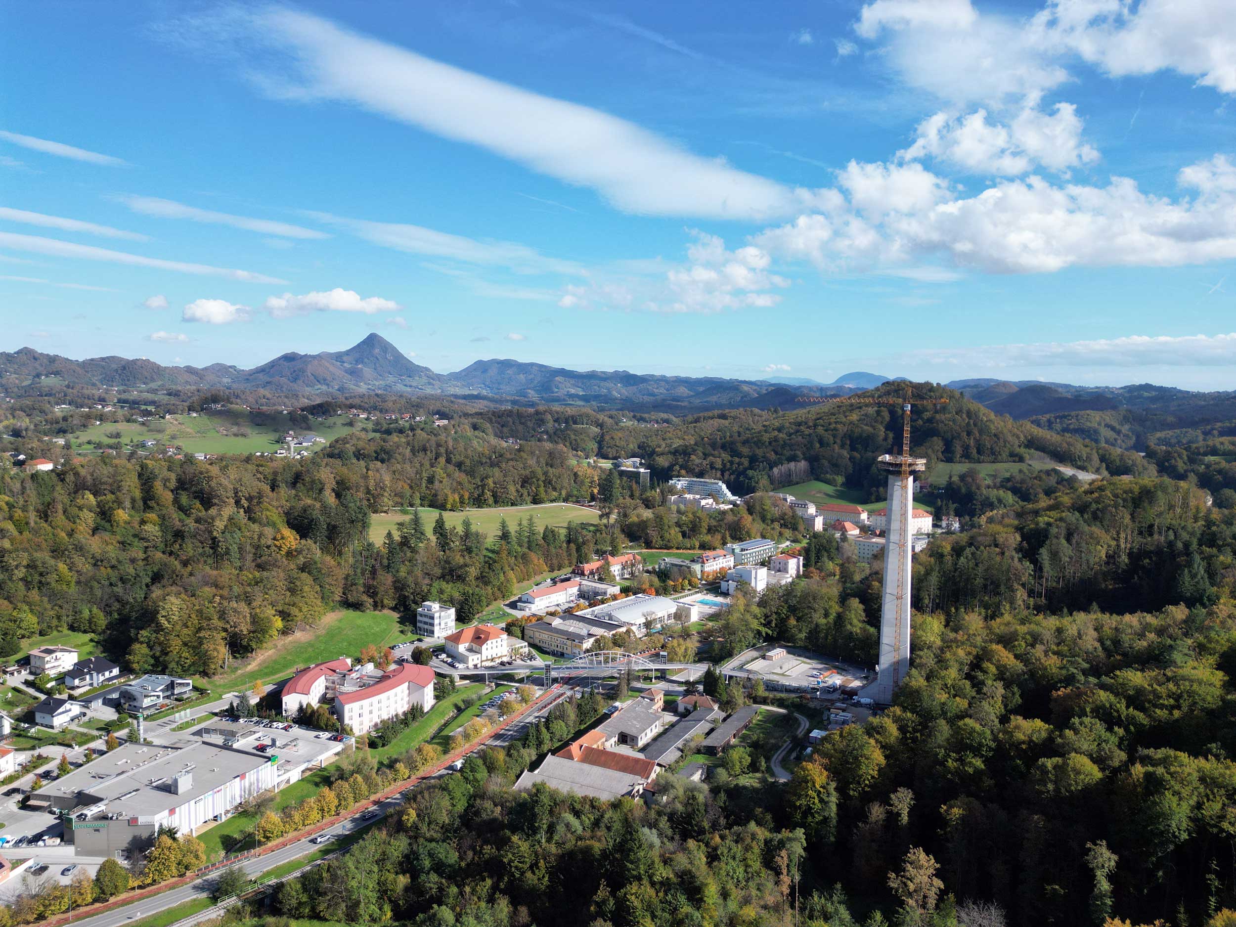 The 106 meters high observation tower with a closed two-storey viewing platform and an open outdoor rooftop observatory is the tallest building in Slovenia of its kind.